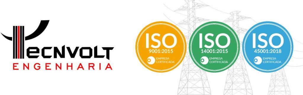 A Tecnvolt é certificada nas normas ISO 9001, 14001 e 45001, assegurando processos controlados, segurança no trabalho e responsabilidade ambiental.